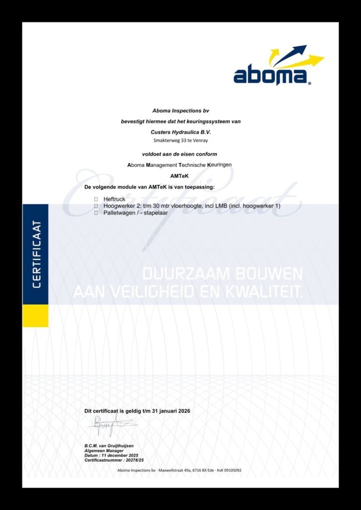 Custers Hydraulica B.V. zet een belangrijke stap in haar dienstverlening aan klanten. Naast de vertrouwde keuringen voor Hoogwerkers (categorie 2), zijn we nu ook officieel AMTeK-gecertificeerd om periodieke veiligheidskeuringen aan Heftrucks en Palletwagens te verrichten.