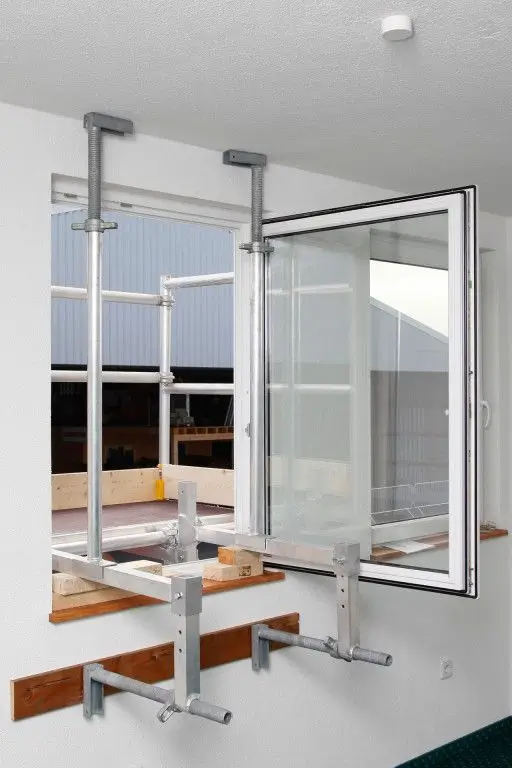 The window scaffold is suitable for work on roller shutters, sun blinds, window frames, or repairing window sills in places where a mobile scaffold cannot be set up. The window scaffold consists of only a few specific parts; the rest are standard parts from the mobile scaffold system. The scaffold is assembled from the window opening. The floor height can be adjusted on the window frame from -0.25 m to +0.25 m. The ceiling supports are available in five separate lengths for a perfect and flexible fit in any window frame.