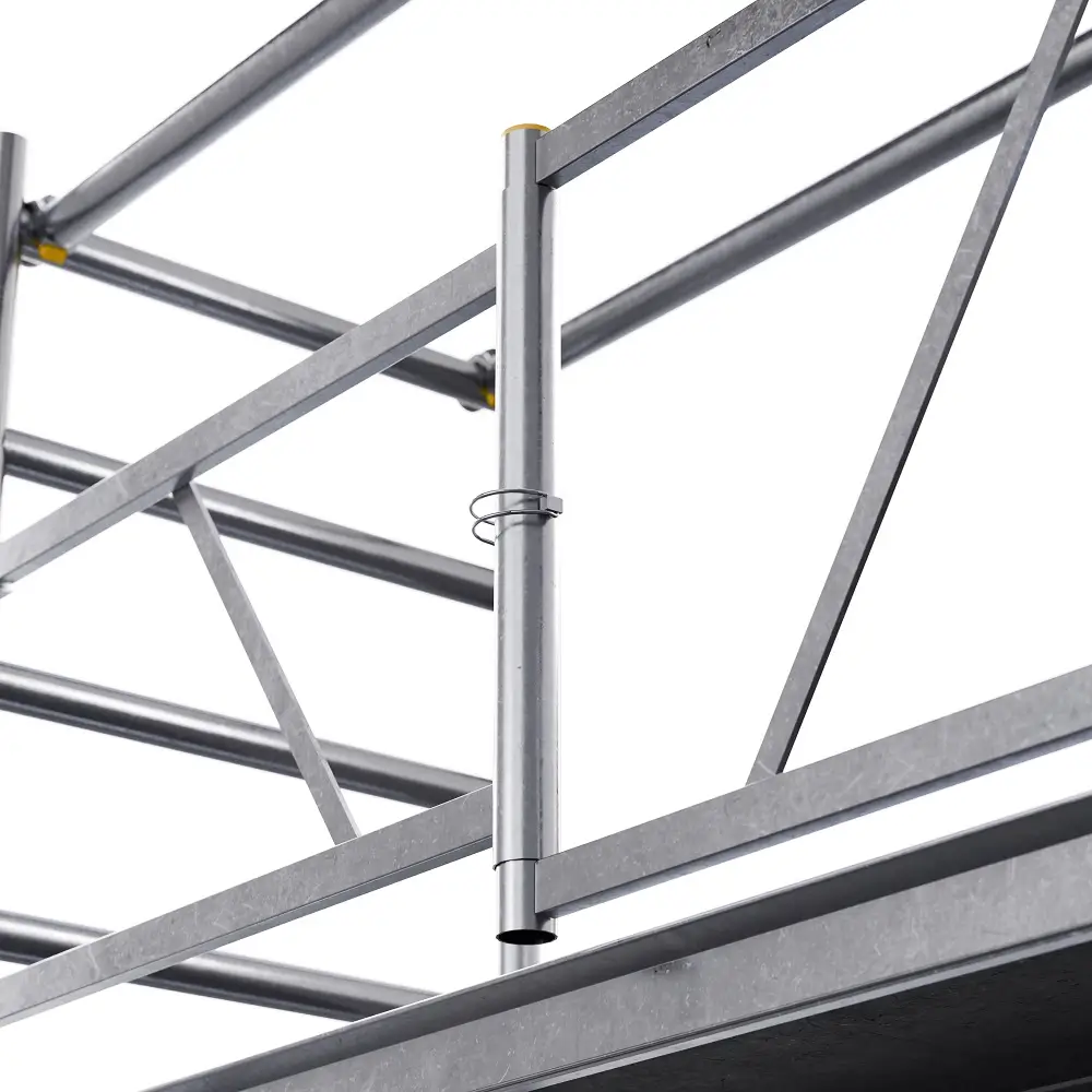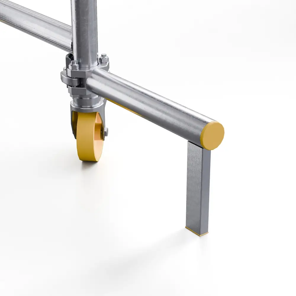 During assembly, the Mobile Guard moves up to the highest level as a temporary guardrail and can be attached at the highest level as a hip guardrail instead of the horizontal rails.